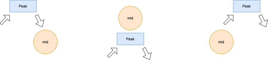 만약 mid 위치의 값이 peak 값이라면, 바로 mid를 리턴하면 된다. 만약 peak가 아니라면, 선택은 두 가지로 나뉘게 된다.