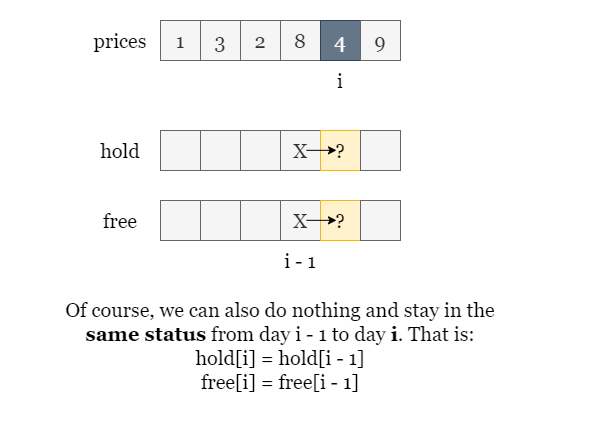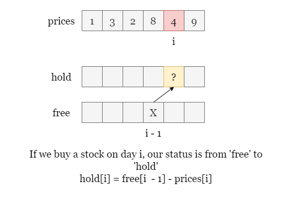 hold[i] = Math.max(hold[i - 1], free[i - 1] - prices[i]);