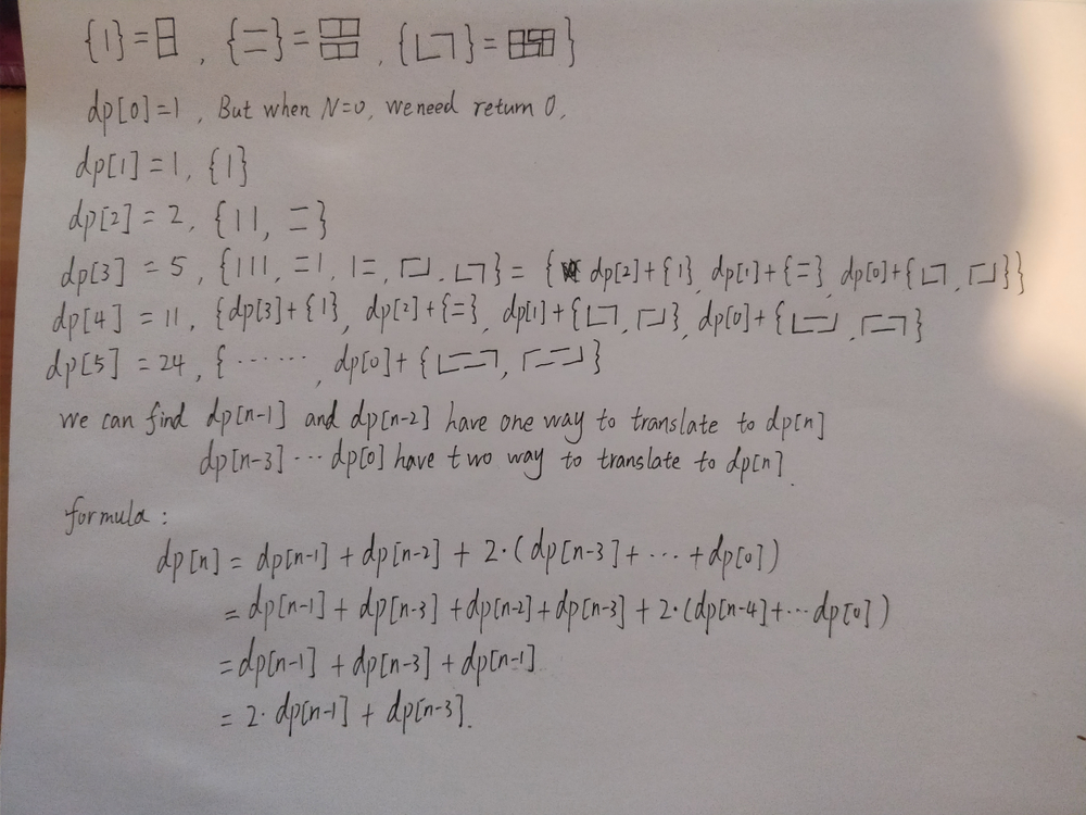 솔루션을 안 보고 풀어봤는데, n = 3까지만 보고 모든 경우가 나왔다고 생각했는데, 2 x 4에서 ⌜⎽⌝, ⌞⎺⌟ 두 가지 경우를 생각하지 못했다. 그런데 n=5 까지만 보고도 점화식을 유도할 수 있다는 게 참 대단한 것 같다. 풀이를 보여주려고 n=5까지만 보여준 건지, 진짜 n=5까지만 본 건지 궁금하다. 🧐